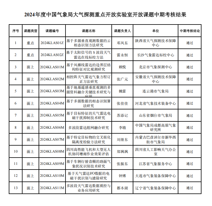 关于公布2024年度中国气象局大气探测重点开放实验室开放课题中期考核结果的通知